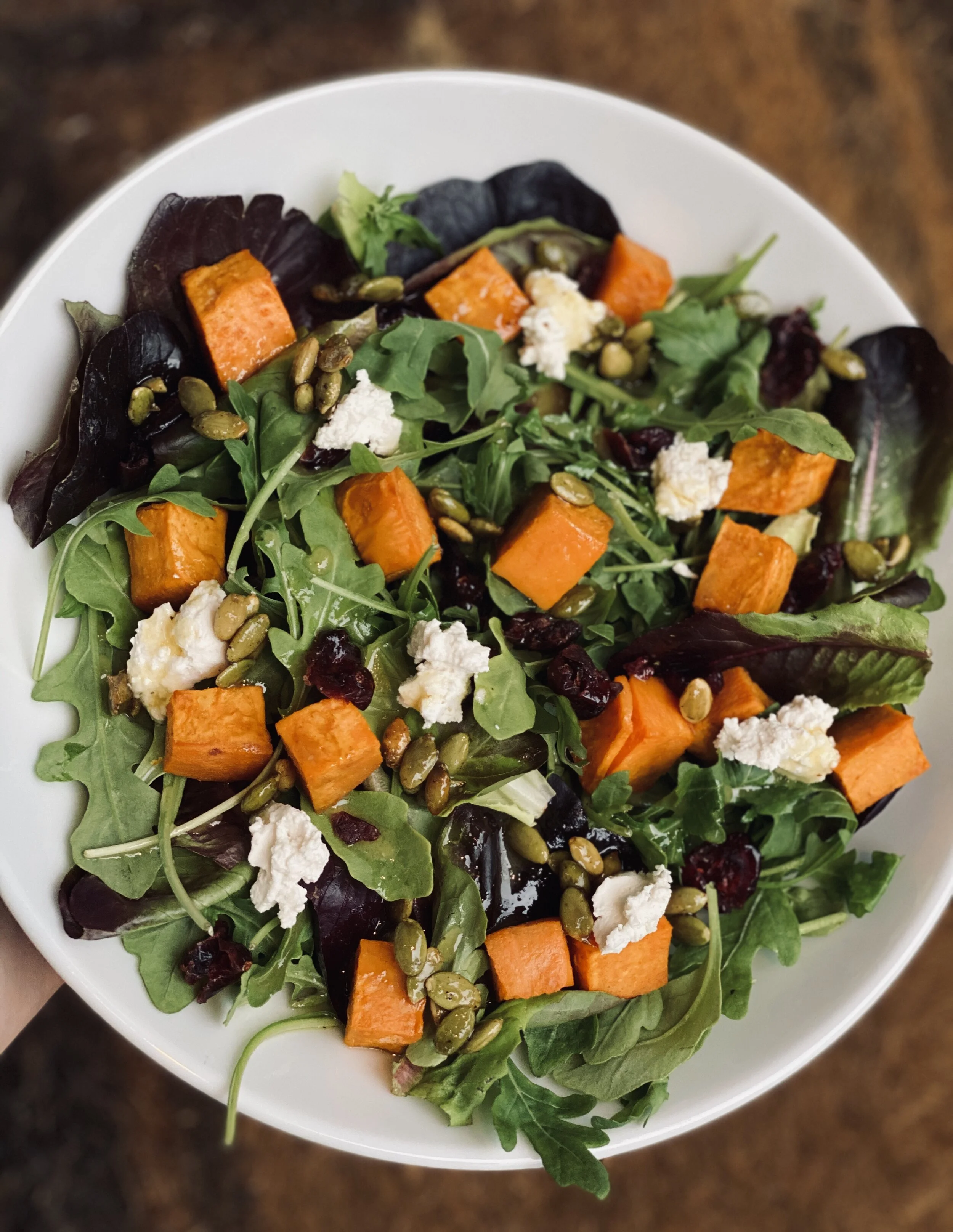 This hearty salad would be a beautiful complement to a soup or as a part of your holiday menu. It has the perfect balance of sweet and savory flavors and the candied pumpkin seeds add a satisfying crunch. High in zinc and vitamin A, it also scores high on the nutritional front.